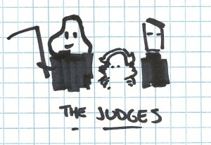 I was at Anime Detour this morning acting as a judge for Iron Artist. I was the surly French Art critic Pierre Lebat. I was joined by Kelvin Hatle as Death and Evan M, who was pressed into service as an Ewok. Lou Frank, one of the fine artists, finished his drawing early and prepared this portrait of the judges.