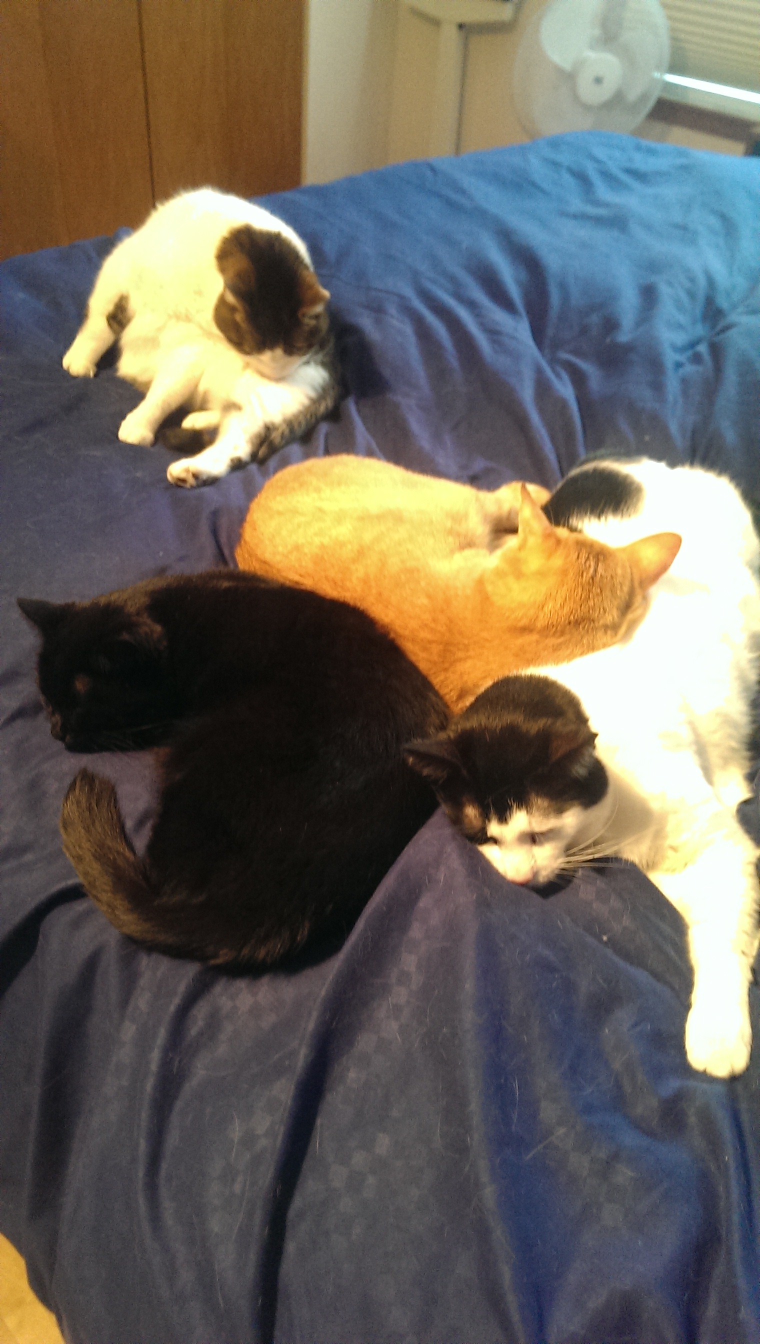 Rule #3: If one of the cats is sleeping under the covers but would be connected with the other three cats if she was on top of the covers, it is still considered a legal plompf.