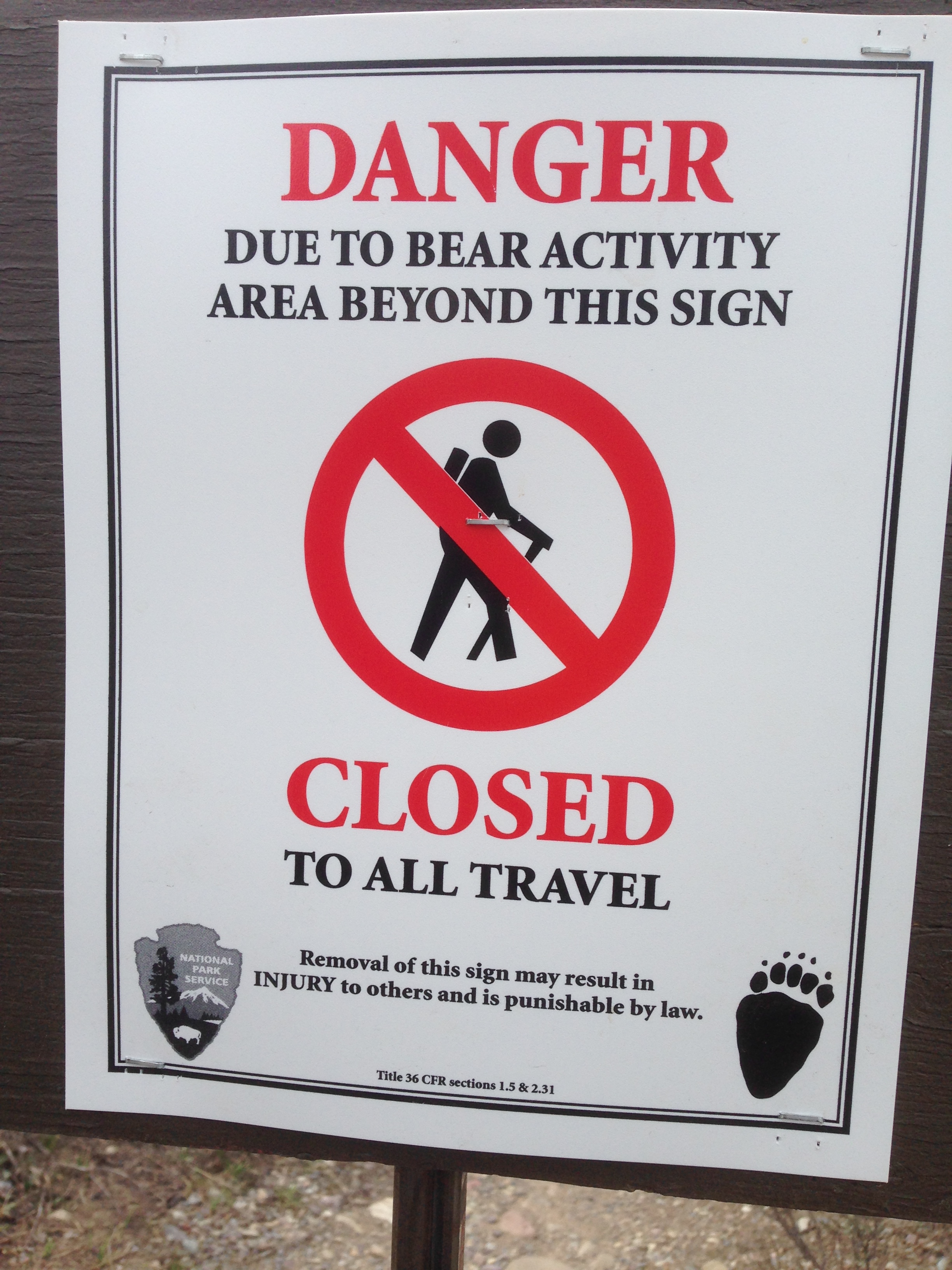 At the bottom of the sign, you are told that removal of this sign could cause injury to others. Because they won’t know there is a BEAR nearby. Probably a mother bear with cubs, given the time of year. Exactly the kind of creature you don’t want to encounter.